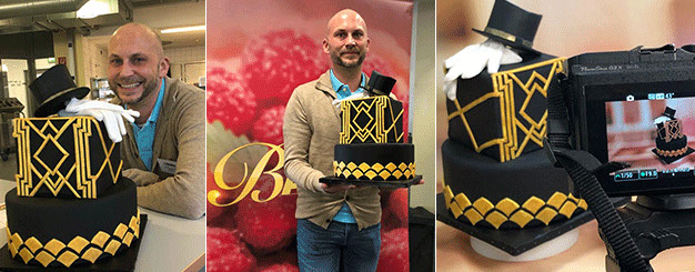 In Köln angekommen ging es zur Registrierung und man befand sich in einem Raum mit 29 anderen HobbybäckerInnen wieder mit unglaublichen Torten. Ich war eingeschüchtert und beeindruckt zugleich und dachte mir: verbuche es als schöne Erfahrung aber du wirst nicht lange hier sein. Bevor es in die Verkostung ging wurden alle Torten auf einem Drehteller gefilmt. Hier überraschte mich mein Partner mit einem Fan-Shirt auf dem er ein Logo mit meinem Gesicht aufgedruckt hatte – ich habe davon im Vorfeld nichts mitbekommen und ich war wie so oft an dem Tag sprachlos.